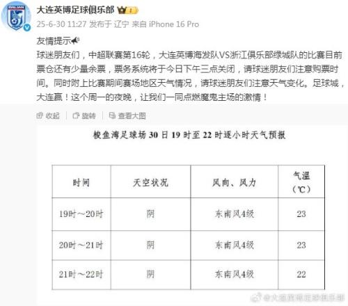 大连英博官博:对阵浙江队还有少量余票,票务系统下午三点关闭