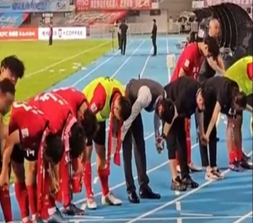 赛后,淮安队主教练董松和球员们90度弯腰向球迷鞠躬,球迷们也迟迟不愿离去,泪目高喊“继续战斗”“一直陪着你们”!