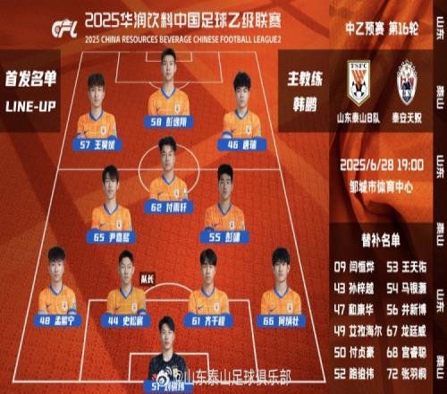 中乙预赛第16轮山东泰山B队主场与泰安天贶队首发阵容,加油