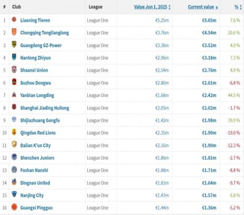体育资讯6月25日报道宣称 日前,德国转会市场网站统计了更新后的中甲球队身价排行。