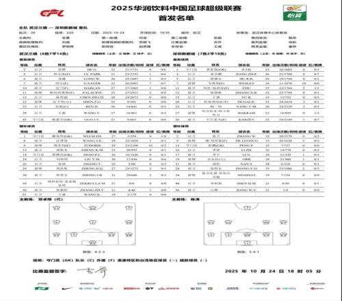 北京时间10月24日19:30,中超第28轮,武汉三镇坐镇主场武汉体育中心体育场迎战深圳新鹏城。本场主裁判张雷,VAR裁判为刘威。双方赛前公布首发名单。