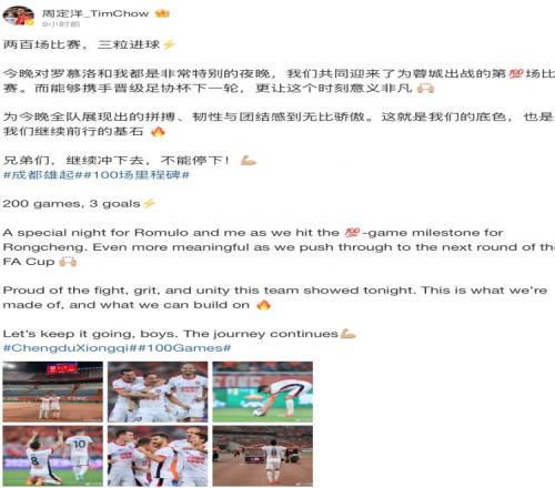 赛后蓉城队长周定洋更新社媒,晒出多张比赛照庆祝比赛胜利,他为照片配文写道: